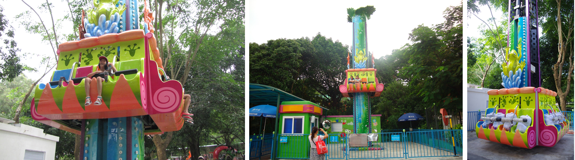 四??蛙跳以跳躍為主題,座艙沿著豎直的?柱軌道作上升、下降和連貫的跳躍運動,使乘客在超重與失重的過程中盡情體驗跳躍樂趣。