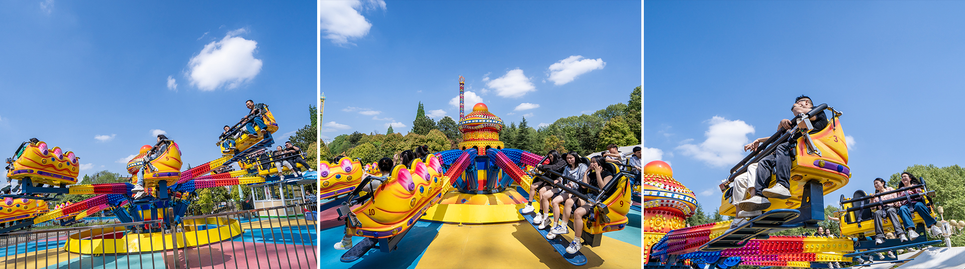 彈跳機中軸為中心帶動周圍十二個座艙繞豎直中軸旋轉,同時座艙伴隨著音樂進行高低、快慢不同的跳躍式運動。使乘客在游玩過程中體驗到旋轉加跳躍的樂趣。