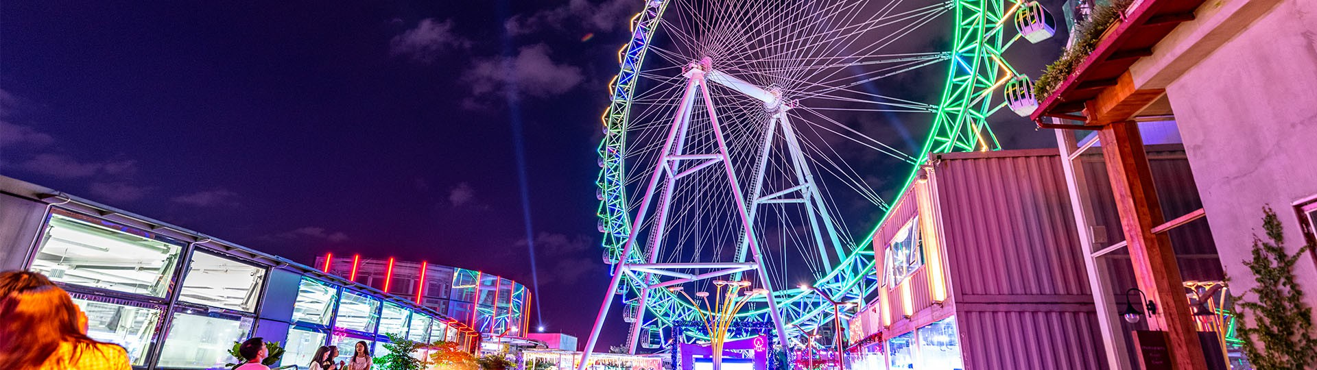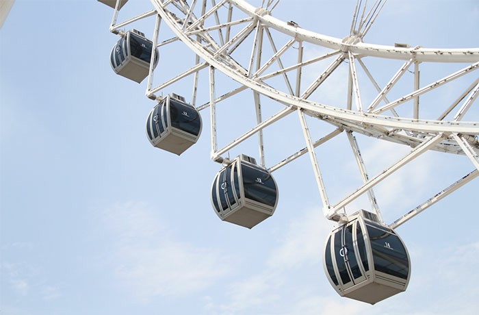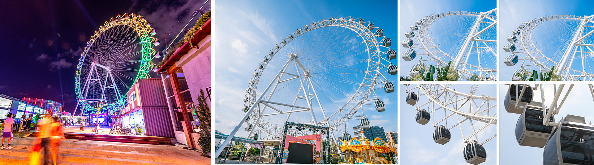 62米觀覽車,塔架由6根立柱構(gòu)成,轉(zhuǎn)盤為輻條式,轉(zhuǎn)盤上均勻分布著36個(gè)吊廂。吊廂運(yùn)作時(shí)配以明麗變幻的燈飾,搭配別具匠心的現(xiàn)場配景,以及柔美動(dòng)聽的背景音樂,乘客在吊箱內(nèi)平穩(wěn)悠閑地縱覽周邊美景。
