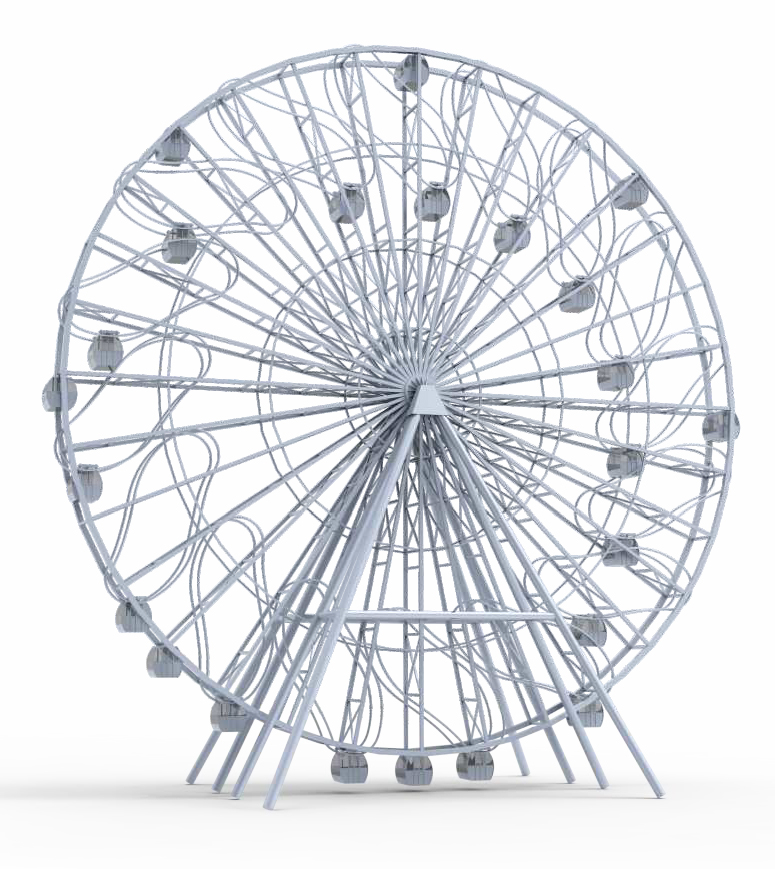 46米搖擺觀覽主體采用經(jīng)典的桁架式結(jié)構(gòu),轉(zhuǎn)盤設(shè)計(jì)有8個(gè)固定座艙及16個(gè)搖擺座艙,兩種不同的座艙形式分別給乘客以傳統(tǒng)游覽車及滑行車的不同體驗(yàn)。吊廂運(yùn)作時(shí)配以明麗變幻的燈飾,搭配別具匠心的內(nèi)飾配景,以及柔美動(dòng)聽的背景音樂,乘客在吊箱內(nèi)多?度地縱覽周邊美景。