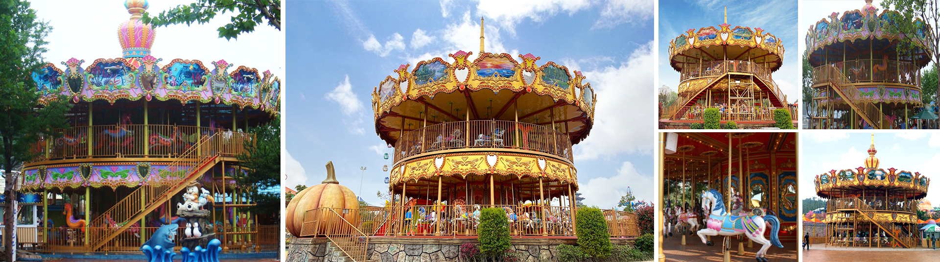 豪華雙層轉(zhuǎn)馬是上、下層可單獨(dú)作旋轉(zhuǎn)運(yùn)動(dòng)的裝飾豪華的轉(zhuǎn)馬,采用歐洲皇家的古典豪華的裝飾風(fēng)格。蓬頂?shù)幕使诩馑睕_云宵,天花板、內(nèi)圍板鑲嵌著彩色浮雕,并配備彩燈。馬匹及宮庭式馬車結(jié)合多彩的花飾,造型奢華大氣流光溢彩。