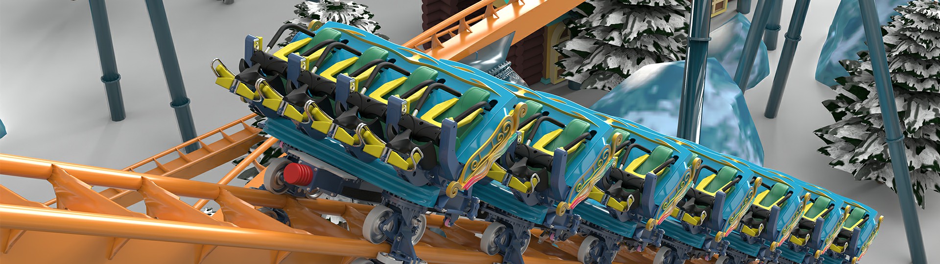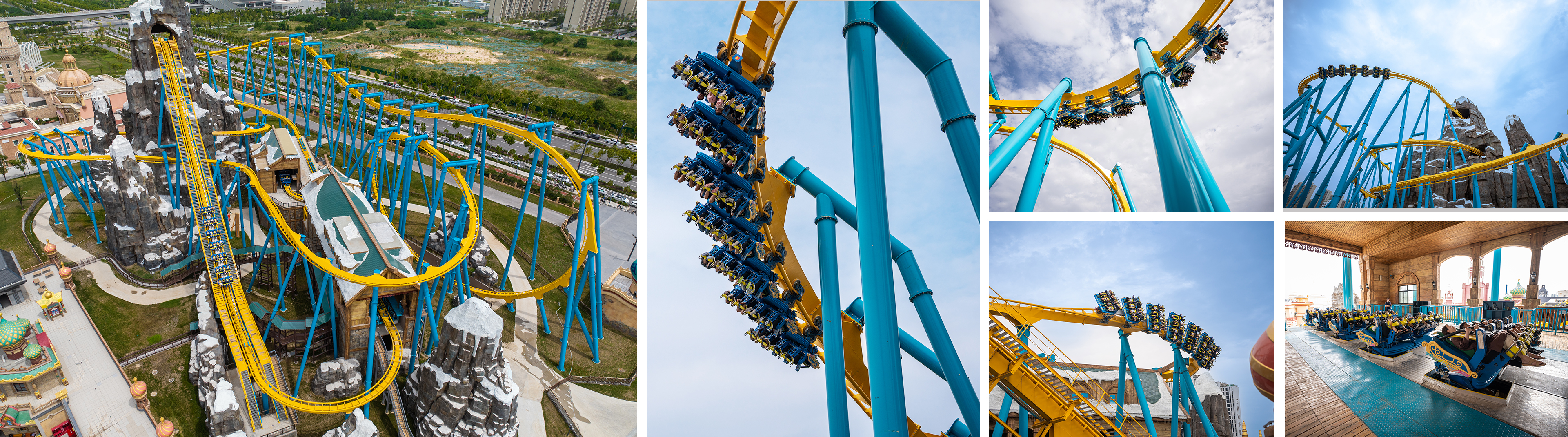 飛行姿態(tài)乘坐式過山車。軌道元素含括急速俯沖飛行、大俯沖飛行、卷餅形倒栽環(huán)、水平環(huán)等,滑行中乘客在軌面仰姿和軌下俯姿兩種姿態(tài)間連續(xù)切換,領(lǐng)略高空翱翔的刺激。與以往的飛行過山車不同,此款飛行過山車車體位于軌道上方,配合水平面上下客平臺(tái),改善了乘客臥姿上下的不適與不便,有效提升舒適度與運(yùn)營(yíng)效率。