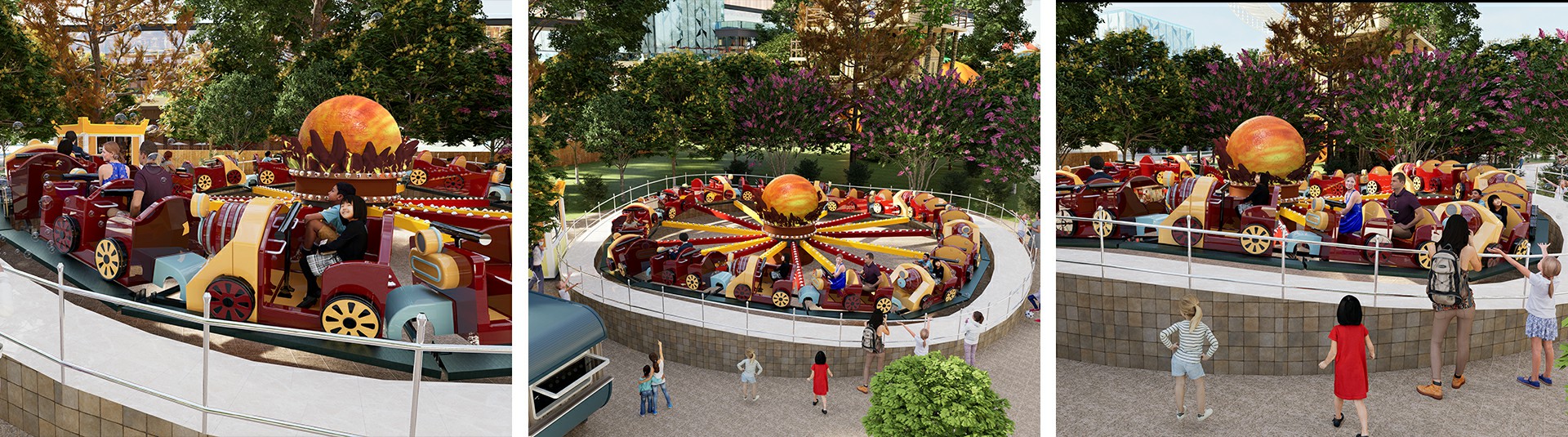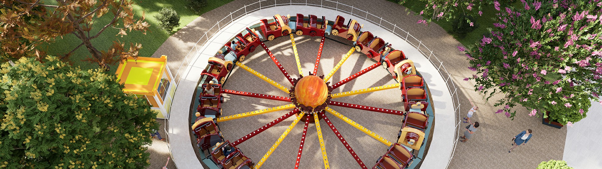 YKC-48B型烈焰戰(zhàn)車,以戰(zhàn)車追逐恒星為主題,中間支撐座裝有回轉(zhuǎn)支承連接16條轉(zhuǎn)臂。每條轉(zhuǎn)臂自帶行走輪,其中四條轉(zhuǎn)臂帶有驅(qū)動裝置,而16個座艙分別安裝在轉(zhuǎn)臂之間。轉(zhuǎn)臂行走輪下方布置有環(huán)形的起伏路軌,在轉(zhuǎn)臂驅(qū)動 裝置的驅(qū)動下,烈焰車體圍繞中心的恒星高低起伏轉(zhuǎn)動,座艙隨轉(zhuǎn)臂旋轉(zhuǎn)運動 的同時,并沿路軌上下運動,使乘客體驗多重復(fù)合旋轉(zhuǎn)運動帶來的樂趣。