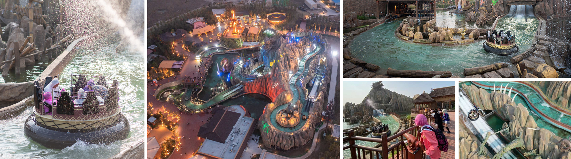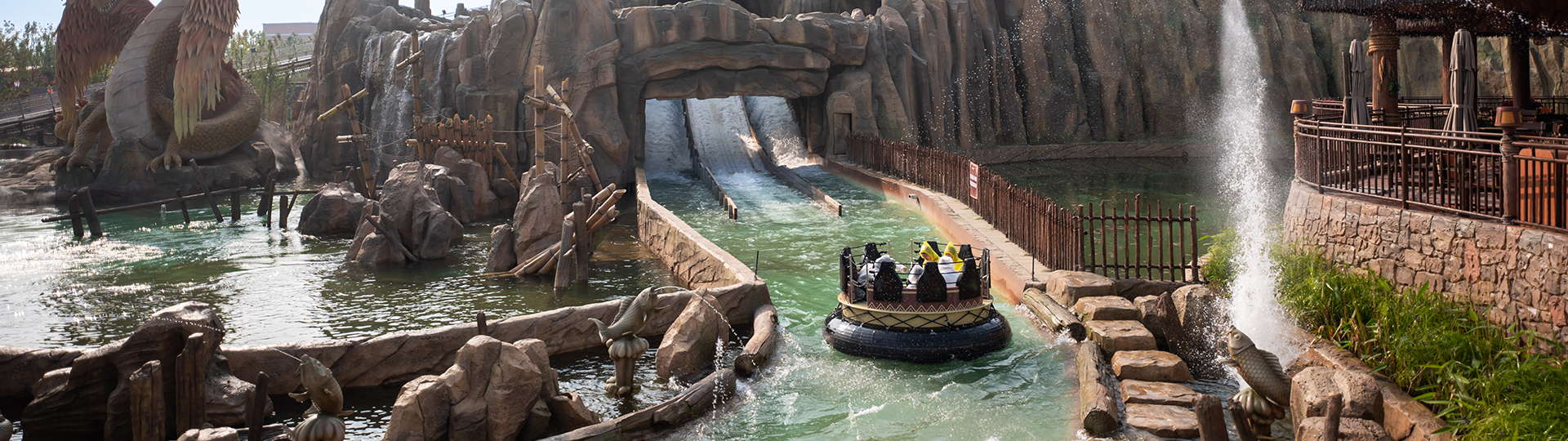 漂流以秘境探險為主題,9人大筏適合家庭、親友一起游玩。漂流速度通過巧妙的水道設(shè)計來控制,速度時而平緩時而急速,漂流筏在水道中時而旋轉(zhuǎn)時而碰撞并兩次下沖,從而讓游客體驗到逼真河道漂流。