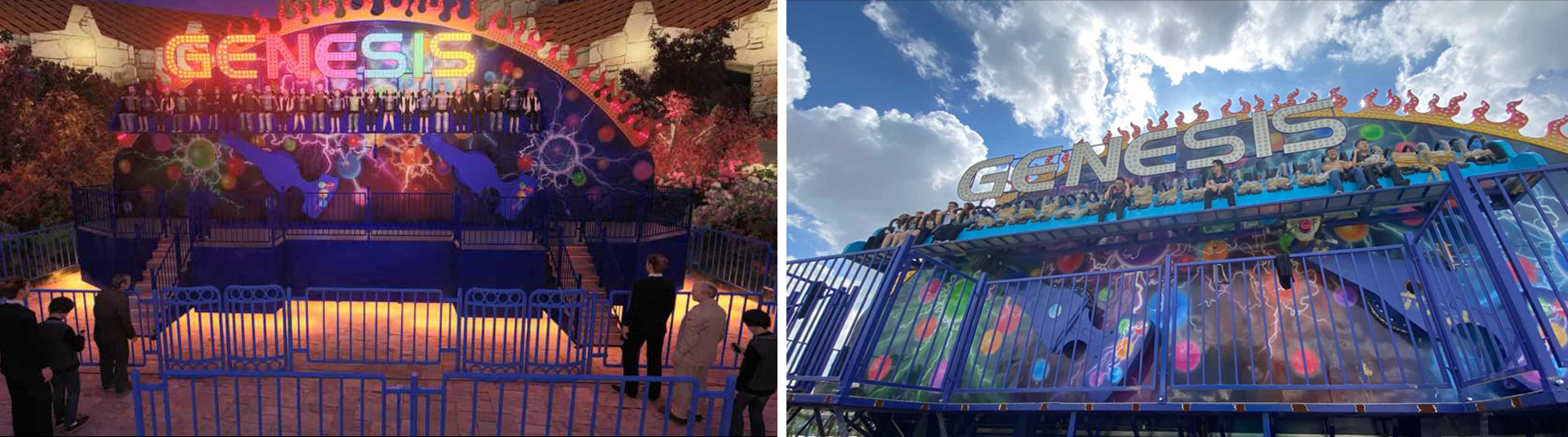 排山倒海在液壓馬達(dá)的驅(qū)動下,兩個擺臂帶動座艙轉(zhuǎn)動,配合座艙的整體平動,實現(xiàn)圓形的座艙運動軌跡。乘客并排座于座艙中充分感受順時、逆時交替變速旋轉(zhuǎn),勢如上山下山的時空交錯感。
