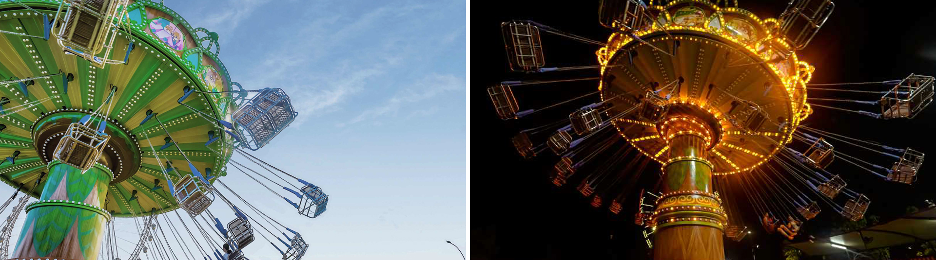 颶風(fēng)飛椅設(shè)備通過傘形轉(zhuǎn)盤的旋轉(zhuǎn)和中間轉(zhuǎn)臺的錯位旋轉(zhuǎn),實現(xiàn)飛椅的波浪式運動,乘客猶如在空中自由飛翔飄蕩。此款飛椅設(shè)有2人座艙,適合家庭親?或情侶游客游玩。