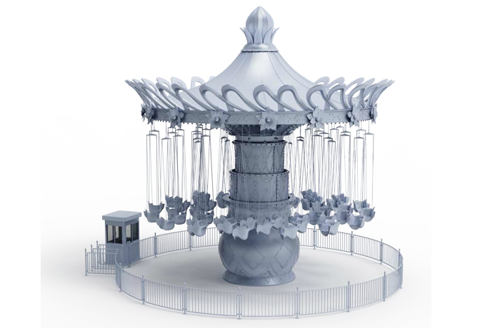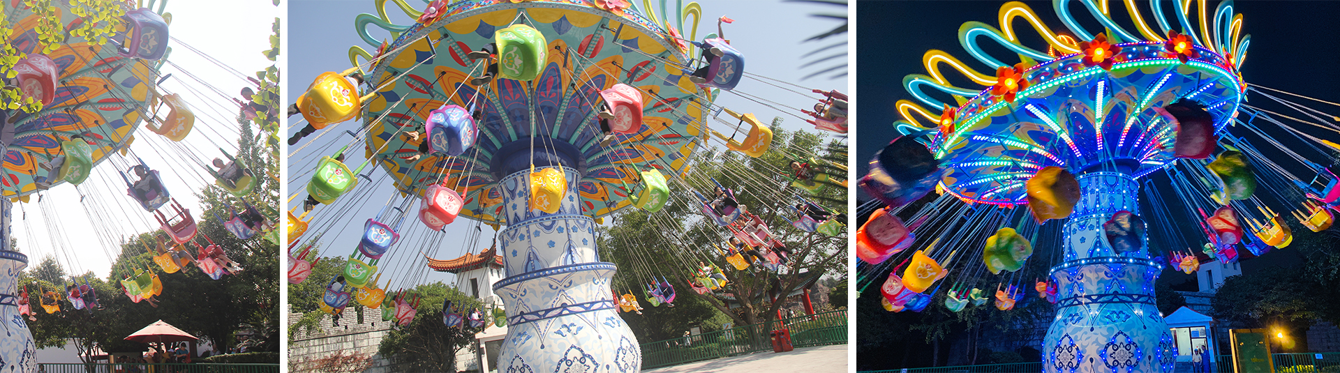 颶風飛椅設備通過傘形轉盤的旋轉和中間轉臺的錯位旋轉,實現飛椅的波浪式運動,乘客猶如在空中自由飛翔飄蕩。