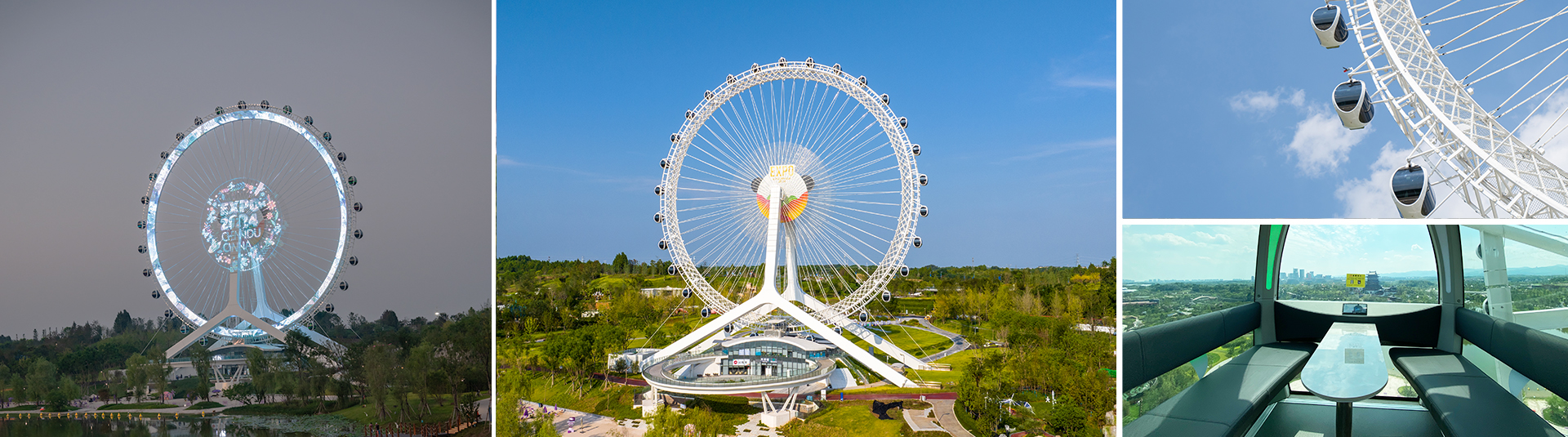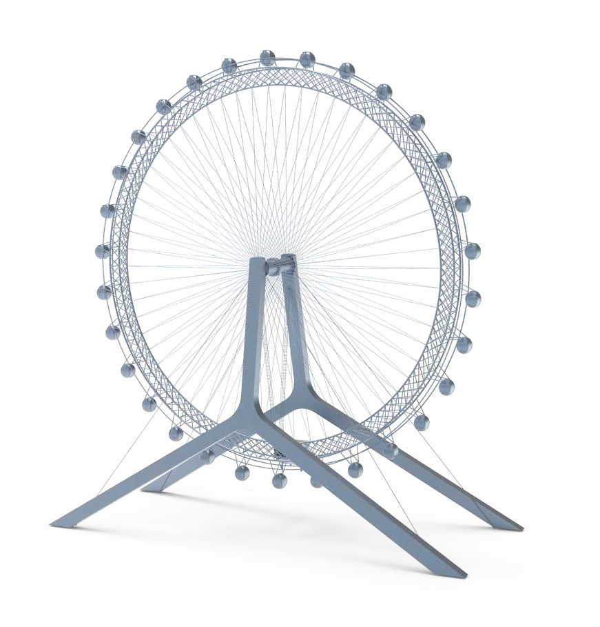 觀覽??架主??為?字形結(jié)構(gòu),轉(zhuǎn)盤為全纜索結(jié)構(gòu),由滾道和鋼纜組成。整體結(jié)構(gòu)科學(xué)合理,外觀簡潔??,充滿了科技感與?量感。觀覽?設(shè)置了30個轎廂,每個可載客8?。為了增添游客的舒適度,轎廂還配備了空調(diào)系統(tǒng)、藍(lán)??響、?線對講機、氛圍燈及內(nèi)飾座椅,在保障安全性的前提下,更具現(xiàn)代感,也更加?性化。