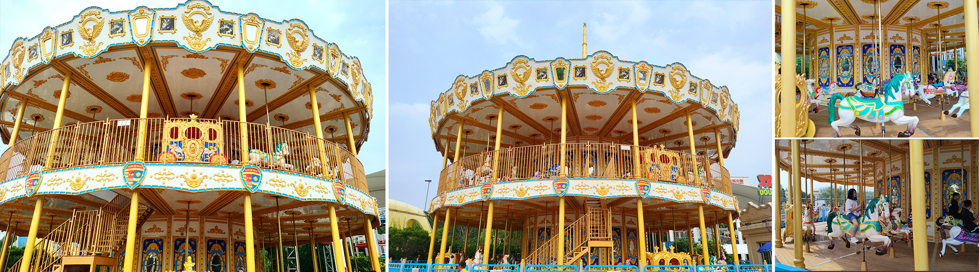 超?型豪華雙層轉(zhuǎn)?以其獨特的雙層結(jié)構(gòu)、豪華裝飾和超?的載客量?成為游樂園中的明星項?,為游客提供了既溫馨?浪漫的游樂體驗。雙層轉(zhuǎn)?的上、下層可以獨?控制,滿?不同載客量的需求;絢爛燈飾效果,為游客打造?夜不同的?氛場景。
